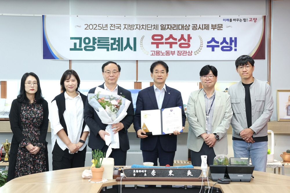 이동환 고양특례시장(오른쪽 세 번째)이 지난 30일 청주 오스코에서 개최된'2025년 전국 지방자치단체 일자리대상'공시제 부문에서 우수상(장관상)을 수상한 직원들과 기념촬영을 하고 있다. 고양특례시 제공