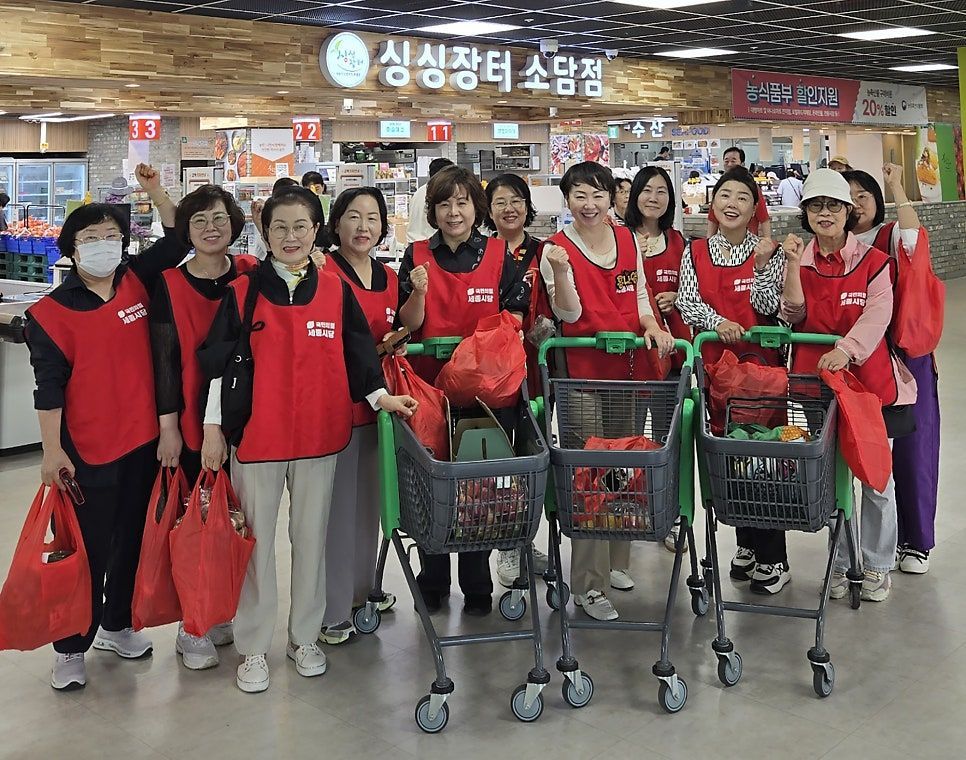 국민의힘 세종시당 홍나영(두번째 카트) 여성위원장이 당원들과 함께 소당동 싱싱장터서 민생행보에 나선 가운데, 장보기를 마치고 기념촬영을 하고 있다. /사진= 여성위원회 제공