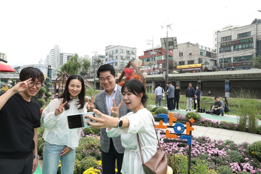 박준희 관악구청장(오른쪽 두 번째)이 별빛내린천에 조성된 국화정원에서 청년들과 인증샷을 찍고 있다. 관악구 제공.