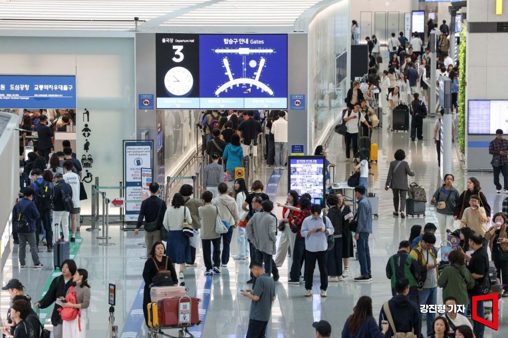 추석 황금연휴를 앞둔 2일 인천국제공항 제1여객터미널을 찾은 여행객들로 붐비고 있다. 2025.10.2 강진형 기자