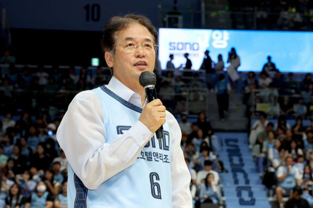 이동환 고양특례시장이 5일 고양 소노 아레나에서 열린 2025-2026시즌 LG전자 프로농구 정규리그 고양 소노 스카이거너스 홈 개막전에서 인사말을 하고 있다. 고양특례시 제공