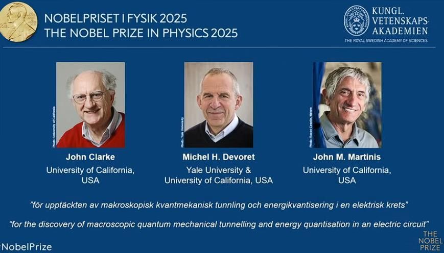 스웨덴 왕립과학한림원 노벨위원회는 "거시적 양자터널링과 전기회로에서의 에너지 양자화를 발견한 공로"를 인정해 이들에게 2025년 노벨물리학상을 수여한다고 7일(현지시간) 발표했다.