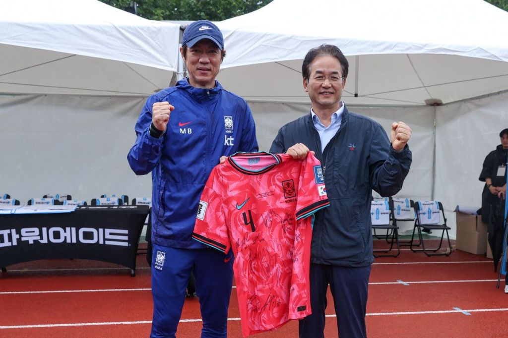 이동환 고양특례시장(오른쪽)과 홍명보 축구 국가대표팀 감독이 지난 7일국가대표팀 선수들의 친필 사인 유니폼을 들고 기념촬영을 하고 있다. 고양특례시 제공