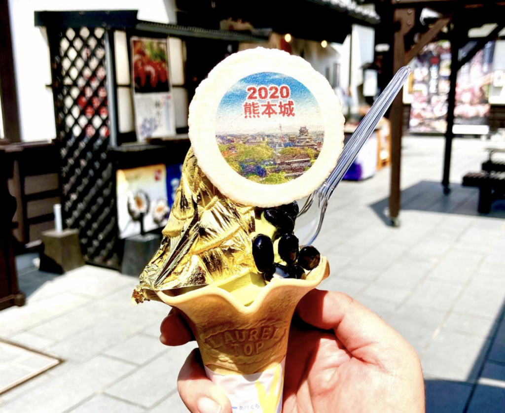 대표 메뉴인 '구마모토성 금박 소프트크림'은 말차 아이스크림 위에 얇은 금박을 한 장 덮어 완성한다. 금박은 시각적 화려함은 있어도 맛 자체에는 큰 영향이 없다는 평가가 많지만, 관광객들에게 지역 기념품 같은 아이스크림으로 인기를 끌어왔다.