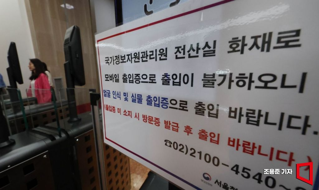 국가정보자원관리원 화재로 정부 전산망이 사실상 마비된 가운데 지난달 29일 서울 종로구 정부서울청사 내 출입구에 '국가정보자원관리원 화재로 모바일 출입증으로 출입 불가' 안내문이 붙어 있다. 2025.9.29 조용준 기자