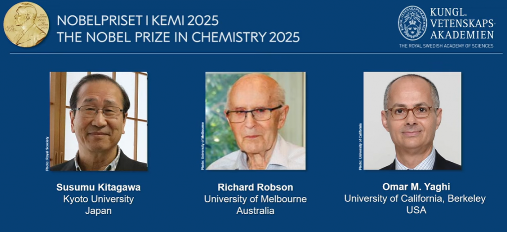 스웨덴 왕립과학원 노벨위원회는 8일(현지시간) 기타가와 스스무(74) 일본 교토대 교수, 리처드 롭슨(88) 호주 멜버른대 교수, 오마르 M. 야기(60) 미국 UC버클리대 교수를 노벨화학상 수상자로 선정했다고 밝혔다.