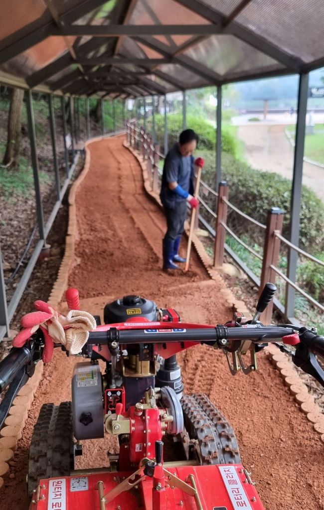다른 1곳인 구미동 공공공지 내 750m 길이의 황톳길은 로터리 기기를 내년도에 추가 구매한 뒤 흙 뒤집기 작업을 한다.