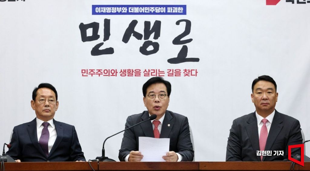 송언석 국민의힘 원내대표가 10일 국회에서 열린 국정감사 대책회의에서 발언하고 있다.