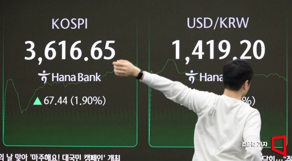 코스피가 사상 첫 3,610선을 돌파한 10일 서울 중구 하나은행 딜링룸 모니터에 코스피를 비롯해 원/달러 환율 등이 표시돼 있다. 이날 코스피 지수는 전 거래일 대비 48.90포인트(1.38%) 오른 3,598.11에, 원/달러 환율은 23.0원 오른 1423.0원, 코스닥은 4.61포인트(0.54%) 오른 858.86에 개장했다. 출발했다.
