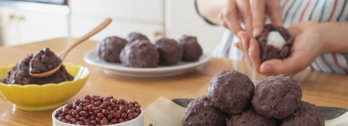 오히간에 먹는 팥떡 '오하기'를 만드는 모습. 하세가와 그룹.
