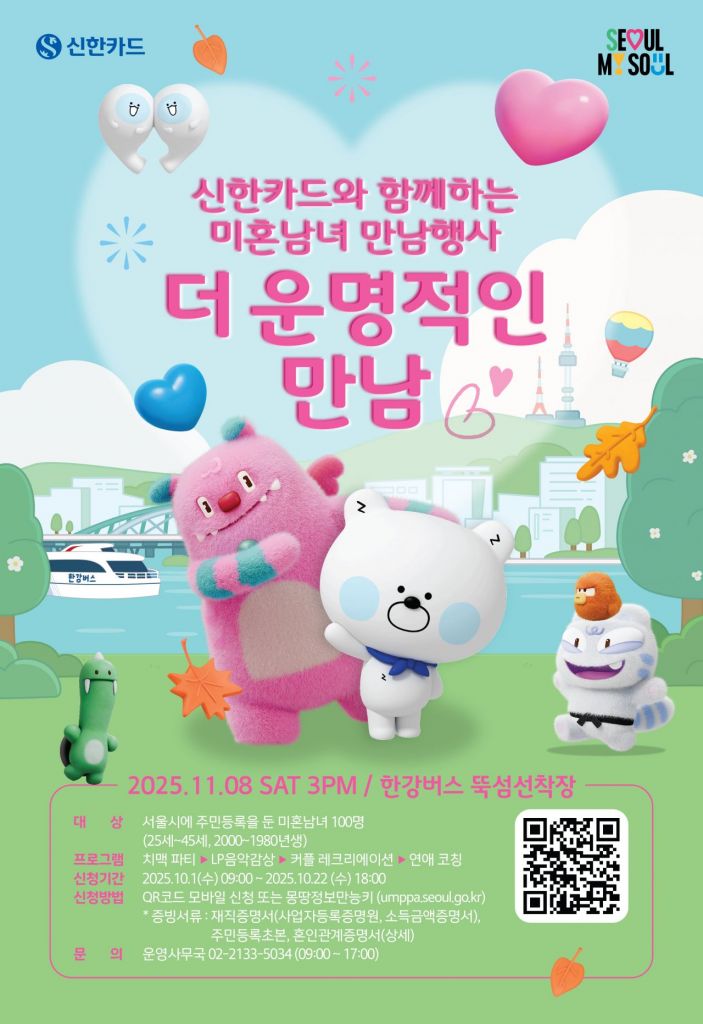 서울시와 신한카드는 남성 참가자들을 위한 메이크업 지원, 전문 MC의 연애 코칭 강의 등 다양한 프로그램을 마련해 참가자들의 행사 참여를 지원한다. 최종 매칭 커플에겐 데이트권 등 선물이 제공된다.