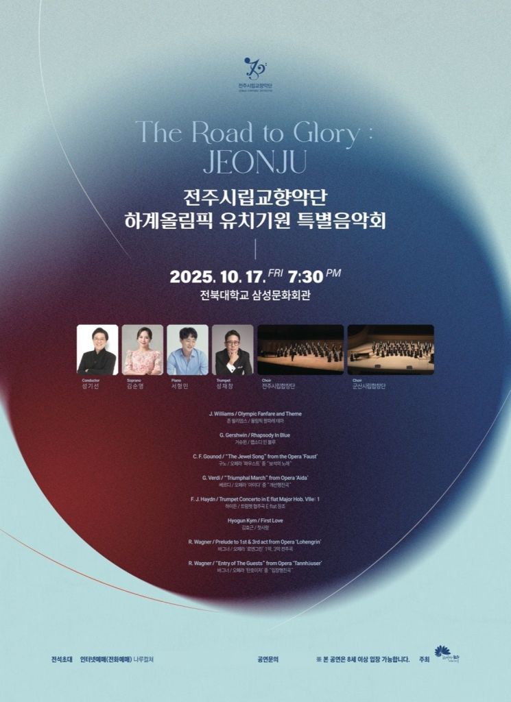 전북 전주시립교향악단(예술감독 겸 지휘자 성기선)이 오는 17일 오후 7시 30분 전북대학교 삼성문화회관에서 'The Road to Glory: Jeonju' 하계올림픽 유치기원 특별음악회를 연다.