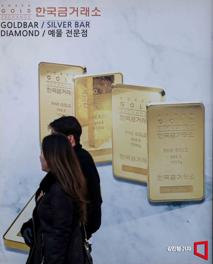 금값이 고공행진하고 있는 가운데 서울 종로구 한국금거래소 종로본점 외벽에 골드바 사진이 붙어 있다