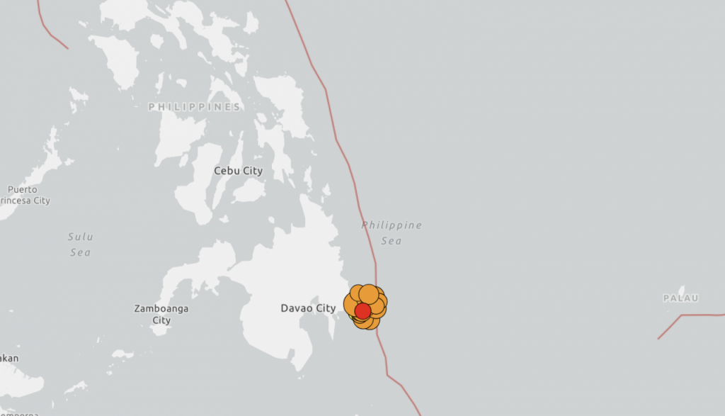 필리핀 남부에 위치한 민다나오섬 동쪽 해안에서 규모 7.4 강진과 6.7 지진이 잇달아 발생했다. U.S. Geological Survey 캡처.