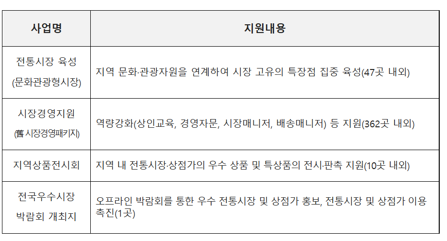 시장경영지원은 지난해와 달리 ▲역량 강화(경영 자문·상인교육) ▲인력지원(시장 매니저·배송 매니저) 등 4개 사업 분야로 개편해 전통시장 및 상점가의 지속 가능한 성장 기반 조성에 중점을 두고 운영할 계획이다. 연간 총 362곳 내외의 시장과 상점가를 지원한다.