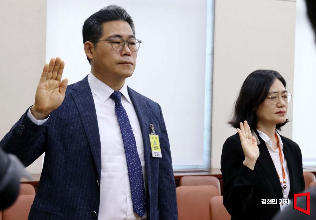 지난 8월 20일 국회에서 열린 행정안전위원회의 '세관 연루 마약 밀반입 사건 수사 외압 의혹 청문회'에서 백해룡 강서경찰서 화곡지구대장(당시 영등포서 형사과장) 등 증인들이 선서하고 있다. 김현민 기자