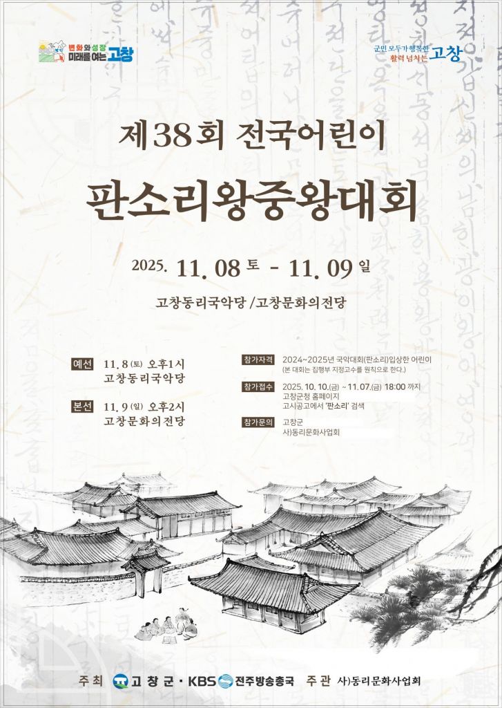고창군과 KBS전주방송총국이 공동 주최하고 ㈔동리문화사업회가 주관한 이번 대회는 고창 동리국악당에서 내달 8일 예선을 거쳐 이튿날(9일) 축하 공연과 병행해 예선을 통과한 7명의 어린이가 본선 경연을 한다.