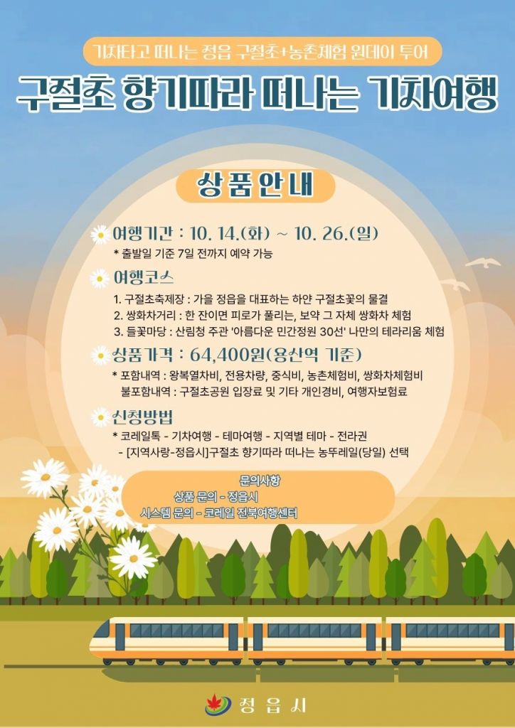 전북 정읍시농업기술센터가 가을 여행철을 맞아 구절초 꽃축제와 농촌체험을 엮은 기차여행 상품 '농뚜레일 투어' 참가자를 오는 19일까지 모집한다.