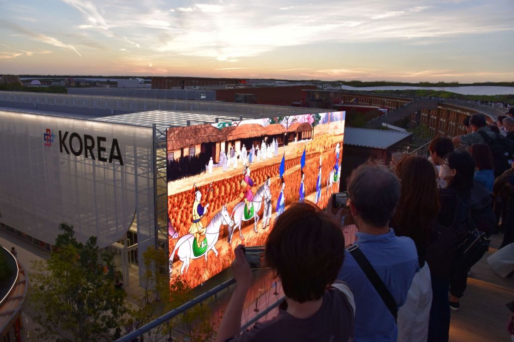 오사카엑스포 그랜드링에서 관람객들이 한국관 미디어파사드를 관람하고 있다. 코트라