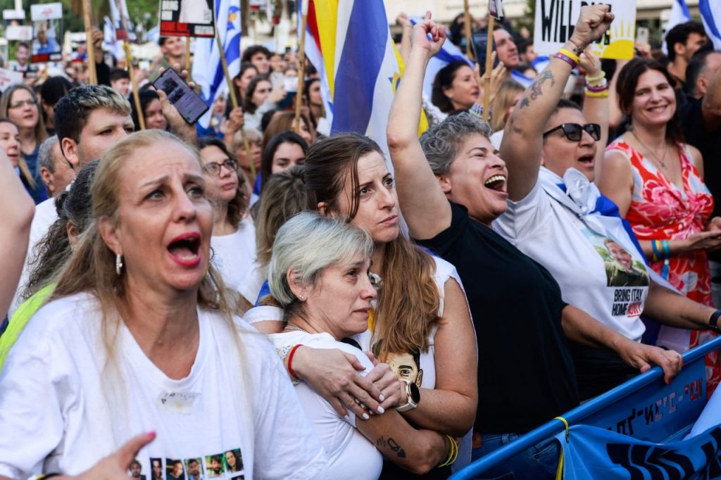 이스라엘 텔아비브의 시민들이 하마스의 인질 석방 소식이 전해진 13일(현지시간) 인질 광장(Hostages Square)에 집결해 있다. AFP연합뉴스