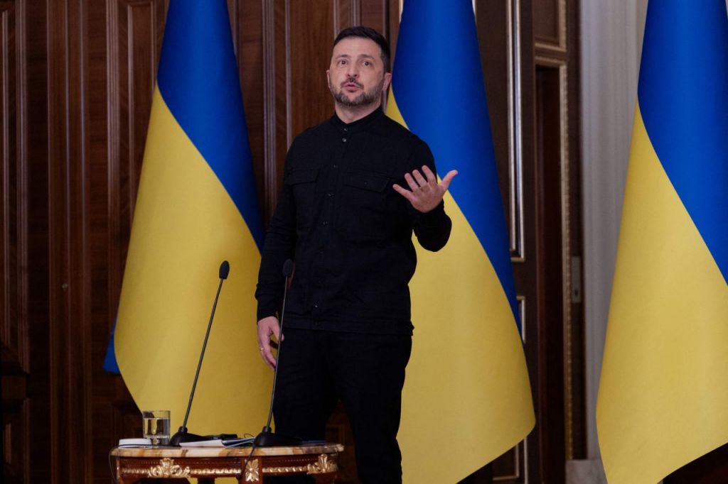 볼로디미르 젤렌스키 우크라이나 대통령이 지난 10일(현지시간) 키이우에서 열린 기자회견에서 연설하고 있다. AFP연합뉴스