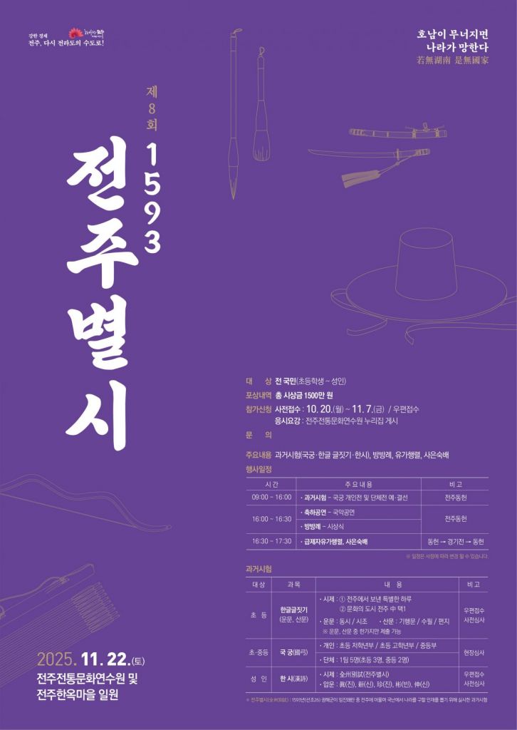 국궁대회 참가 신청 및 한글 글짓기·한시 원고 접수 기간은 내달 7일까지이며, 자세한 사항은 전주전통문화연수원 누리집을 참고하면 된다.
