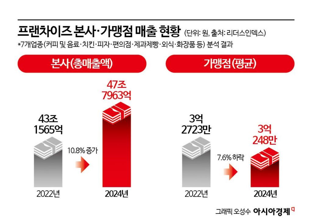 이같은 구조 속에서 프랜차이즈 본사와 가맹점 사이 매출 격차는 점점 커지고 있다. 기업분석연구소 리더스인덱스가 공정거래위원회 가맹사업정보시스템과 전자공시 시스템 정보를 분석한 결과, 2022~2024년 프랜차이즈 115곳의 가맹점 평균매출액은 3억2723만원에서 3억248만원으로 7.6% 감소했다. 반면 프랜차이즈 본사의 총매출액은 같은 기간 43조1565억원에서 47조7963억원으로 10.8% 뛰었다.