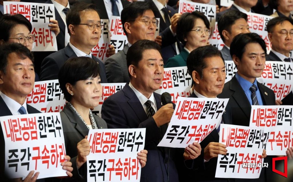 김병기 더불어민주당 원내대표가 14일 국회 로텐더홀 계단에서 열린 한덕수 등 국무위원 내란공모 규탄 기자회견에서 발언하고 있다.