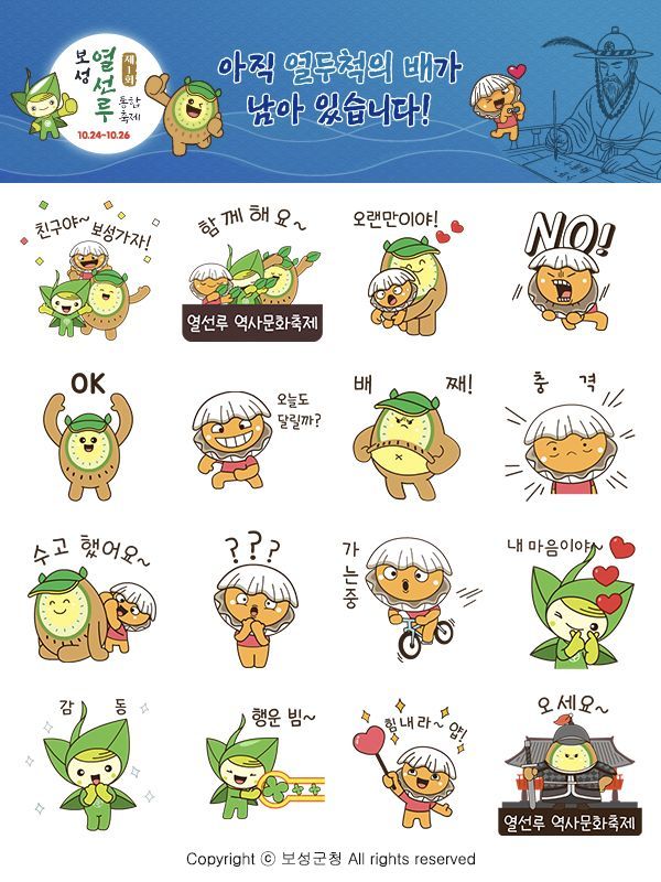이번 이모티콘 무료 배포는 오는 24일부터 3일 동안 열리는 '제1회 보성 열선루 이순신 역사문화축제'를 널리 알리기 위한 것으로, 보성의 대표 특산물인 녹차·꼬막·키위를 의인화한 캐릭터 BS삼총사를 귀엽고 익살스럽게 표현했다.