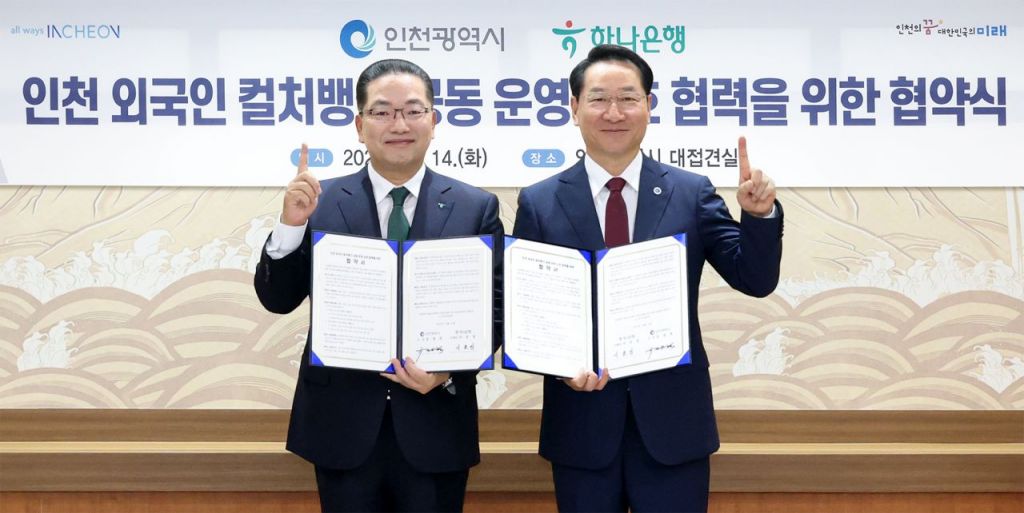 하나은행은 14일 오전 인천시청에서 인천광역시와 함께 '인천 외국인 컬처뱅크' 공동 운영을 위한 업무협약을 체결했다고 밝혔다.