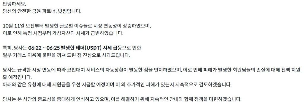 빗썸은 "급격한 시장 변동에 따라 코인 대여 서비스의 자동상환이 발동한 점을 인지했다"며 "피해가 발생한 회원님들의 손실에 대해 전액 지원할 예정"이라고 설명했다.