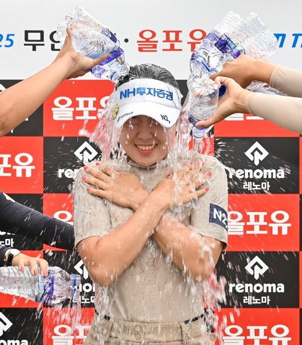 최정원이 KLPGA 2025 무안CC·올포유 드림 투어 18차전 우승 직후 축하 물 세례를 받고 있다. KLPGA 제공