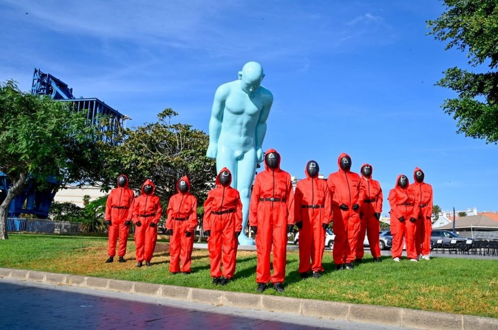 스페인령 카나리아 제도 라스팔마스의 라루스항에서 한·스페인 수교 75주년을 기념해 한인 어부들의 노고를 기리는 조각상 '그리팅맨' 제막식이 열린 가운데 '오징어게임' 복장을 한 한류 팬들이 기념 촬영을 하고 있다. 주스페인 대사관 라스팔마스 분관