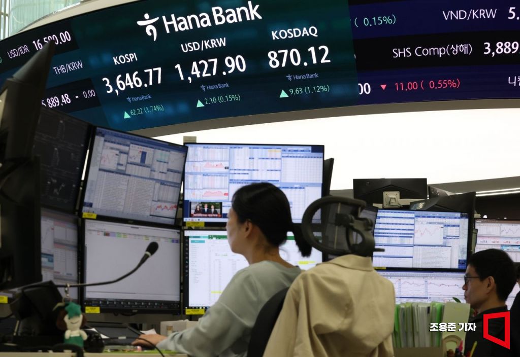 코스피가 장중 사상 최고치를 경신한 14일 서울 중구 하나은행 딜링룸 현황판에 코스피, 원/달러 환율 등이 표시돼 있다. 2025.10.14 조용준 기자