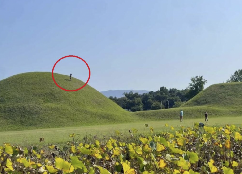 최근 경주 신라 고분 위에 아이가 올라가 있는 모습이 포착된 장면. 온라인 커뮤니티