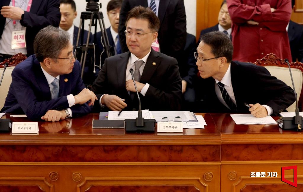 조현 외교부 장관(왼쪽)이 15일 서울 종로구 정부서울청사에서 열린 "치안 안전 관계 장관회의"에 앞서 유재성 경찰청장 직무대행(오른쪽)과 이야기를 나누고 있다.