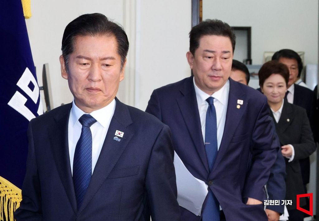 정청래 더불어민주당 대표와 김병기 원내대표가 15일 국회에서 열린 최고위원회의에 참석하고 있다. 2025.10.15 김현민 기자