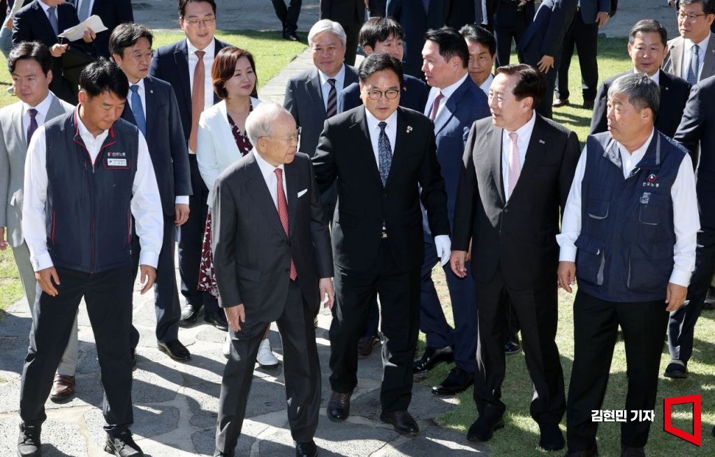 우원식 국회의장과 노사 5단체 대표 등 참석자들이 15일 국회 사랑재에서 열린 사회적 대화 공동선언식에서 기념 식수를 마치고 행사장으로 이동하고 있다.