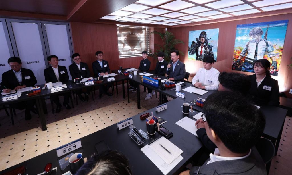이재명 대통령이 15일 국내 게임사 크래프톤의 게임ㆍ문화 플랫폼 서울 성동구 '펍지 성수'에서 K-게임 현장 간담회를 하고 있다. [대통령실통신사진기자단]