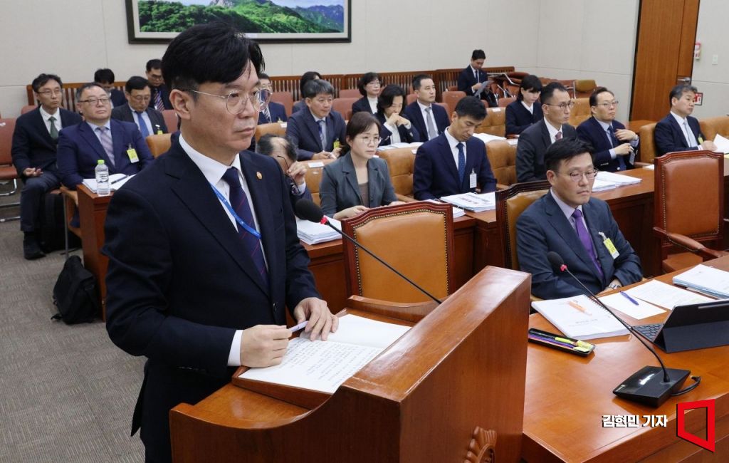 김영훈 고용노동부 장관이 15일 국회에서 열린 고용노동부에 대한 국회 기후에너지환경고용노동위원회의 국정감사에서 업무보고를 하고 있다.
