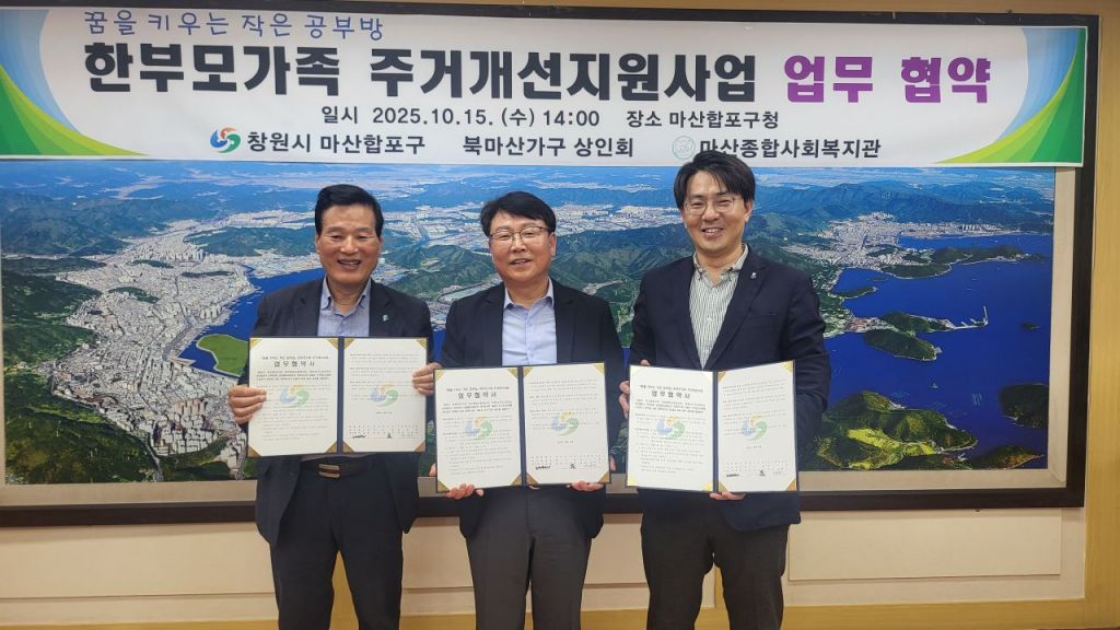 경남 창원특례시 마산합포구는 15일 구청에서 한부모가족 아동의 주거환경을 개선하기 위한 「꿈을 키우는 작은 공부방」 사업 협약식을 열었다.