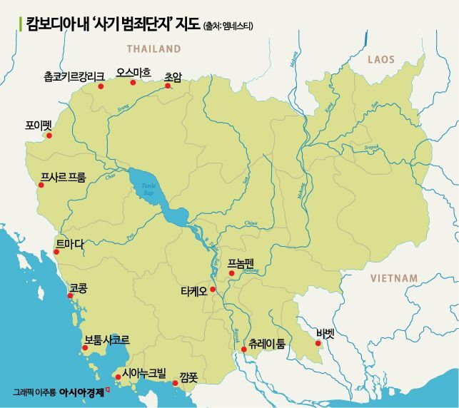 베네딕트 호프만 유엔마약·범죄사무소(UNODC) 동남아시아·태평양 지역 부대표는 지난 4월 발표한 보고서(Global Implications of Scam Centres, Underground Banking and Illicit Online Marketplaces in Southeast Asia)에서 캄보디아 내 사기 조직 생태계를 이렇게 묘사했다. 그는 "당국이 한 지역을 단속해도 뿌리가 사라지는 것이 아니라 다른 곳으로 옮아간다"며 결국 지역 전체가 서로 연결된 하나의 범죄 생태계로 변했다고 분석했다.