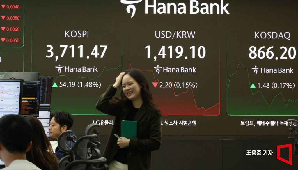 코스피가 장중 연고점을 찍으며 거침없이 상승하고 있는 16일 서울 중구 하나은행 딜링룸 현황판에 코스피 지수 등이 표시되고 있다. 이날 코스피 지수는 전 거래일 대비 18.54포인트(0.51%) 오른 3,675.82에, 코스닥은 2.10포인트(0.24%) 오른 866.82에 개장했다.