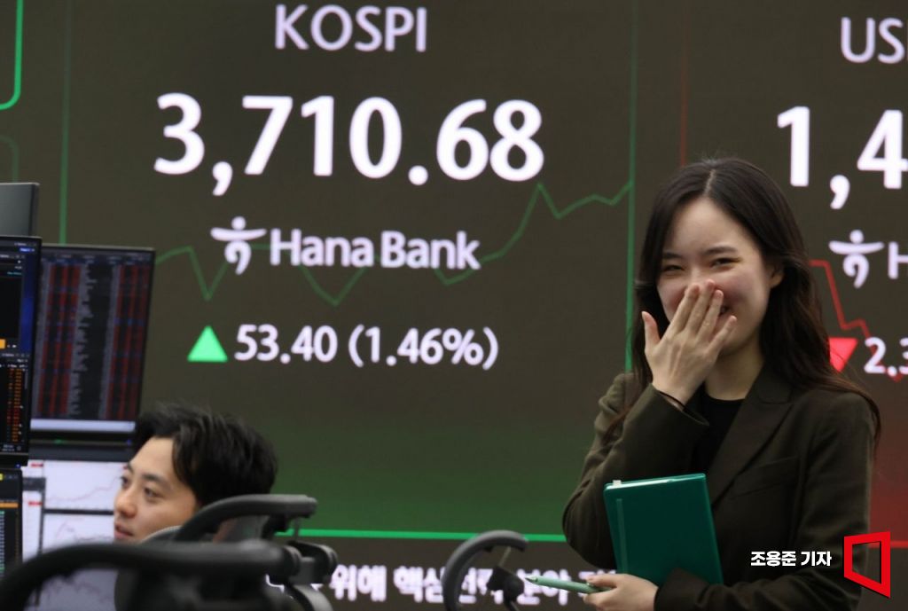 코스피가 장중 연고점을 찍으며 거침없이 상승하고 있는 16일 서울 중구 하나은행 딜링룸 현황판에 코스피 지수 등이 표시되고 있다. 이날 코스피 지수는 전 거래일 대비 18.54포인트(0.51%) 오른 3,675.82에, 코스닥은 2.10포인트(0.24%) 오른 866.82에 개장했다.