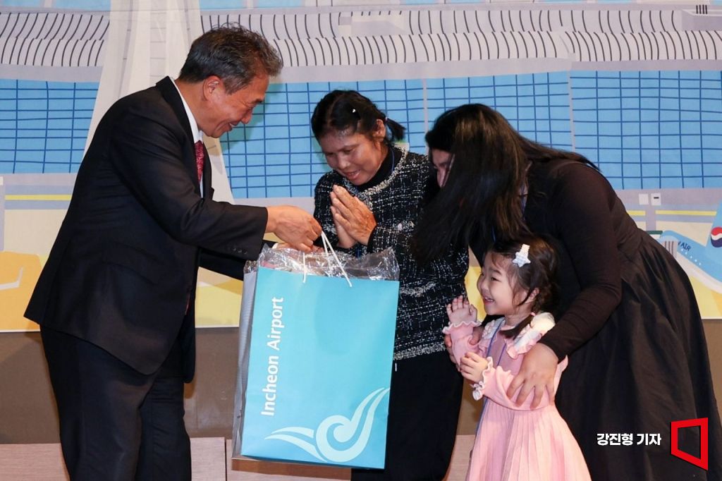이학재 인천국제공항공사 사장이 16일 인천 중구 인천국제공항공사 항공교육원에서 열린 '다문화가족 부모초청 환영행사'에서 국가별 대표 가정에게 기념품을 전달하고 있다.