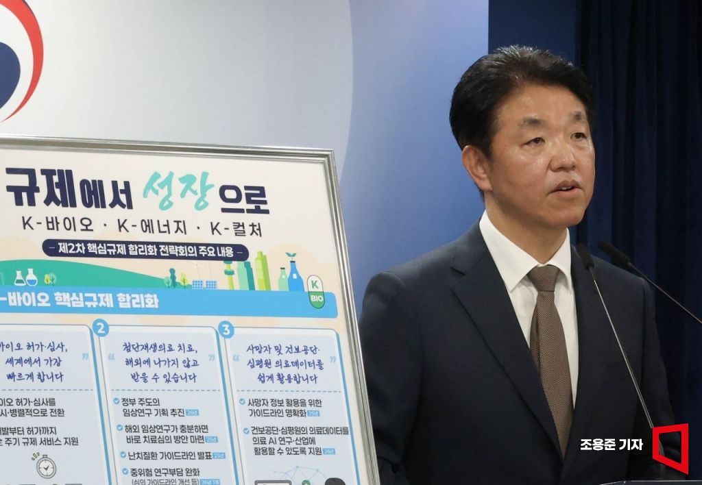 손동균 규제조정실장 16일 서울 종로구 정부서울청사에서 K-컬쳐, K-바이오 등 2차 핵심규제 합리화 전략회의 주요내용을 브리핑하고 있다.