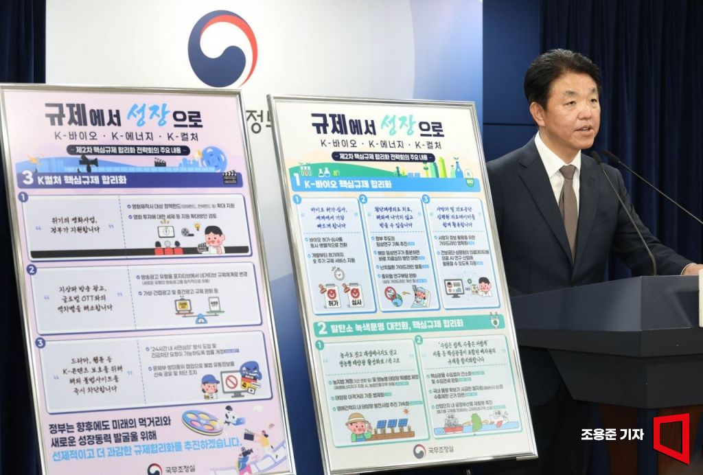 손동균 규제조정실장 16일 서울 종로구 정부서울청사에서 K-컬쳐, K-바이오 등 2차 핵심규제 합리화 전략회의 주요내용을 브리핑하고 있다.