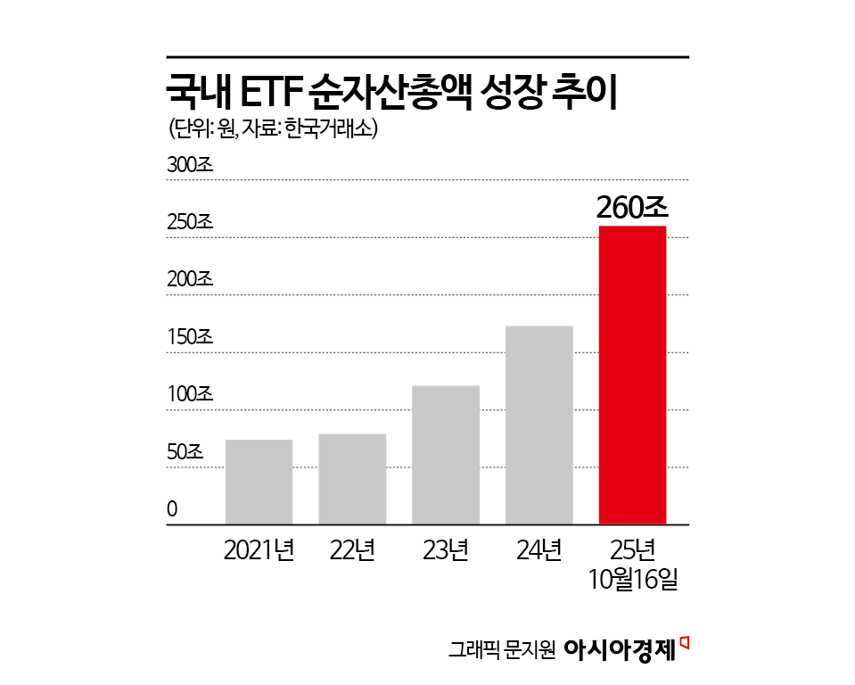 올해 상반기 200조원을 돌파한 국내 상장지수펀드(ETF) 시장 규모가 4개월 만에 260조원으로 불어났다. 국내 증시로 자금이 몰려드는 가운데 ETF는 '국민 재테크 수단'으로 자리매김하고 있다. 국내 자산운용사들도 ETF 시장 점유율을 높이기 위해 치열하게 경쟁 중이다.