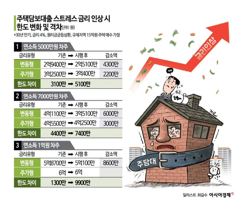 은행권 관계자는 "이번 스트레스 금리 상향으로 주기형 대출은 평균 6~7%가량 대출 한도가 축소되는 반면, 변동형은 약 15%가 줄어든다"며 "변동형보다 고정형을 선택하는 것이 대출 한도 측면에서는 더 유리한 상황"이라고 말했다.