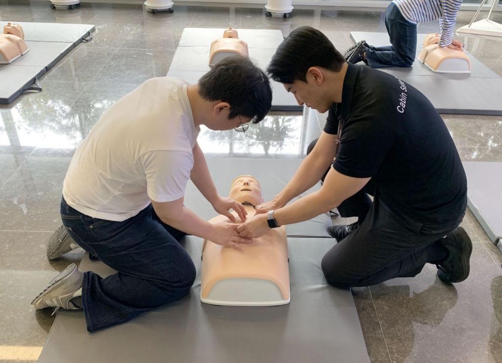 에어부산 사옥에서 진행된 산업재해 비상대응 훈련에 참여한 임직원이 심폐소생술 교육을 받고 있다. 에어부산 제공